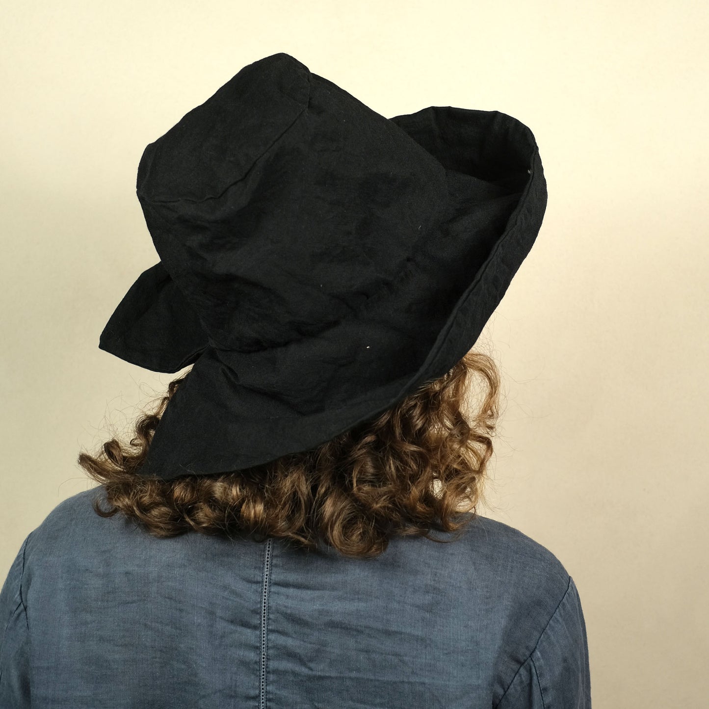 BIANCA is a hat with a wide, soft visor and an opening at the back, like a swallowtail.
