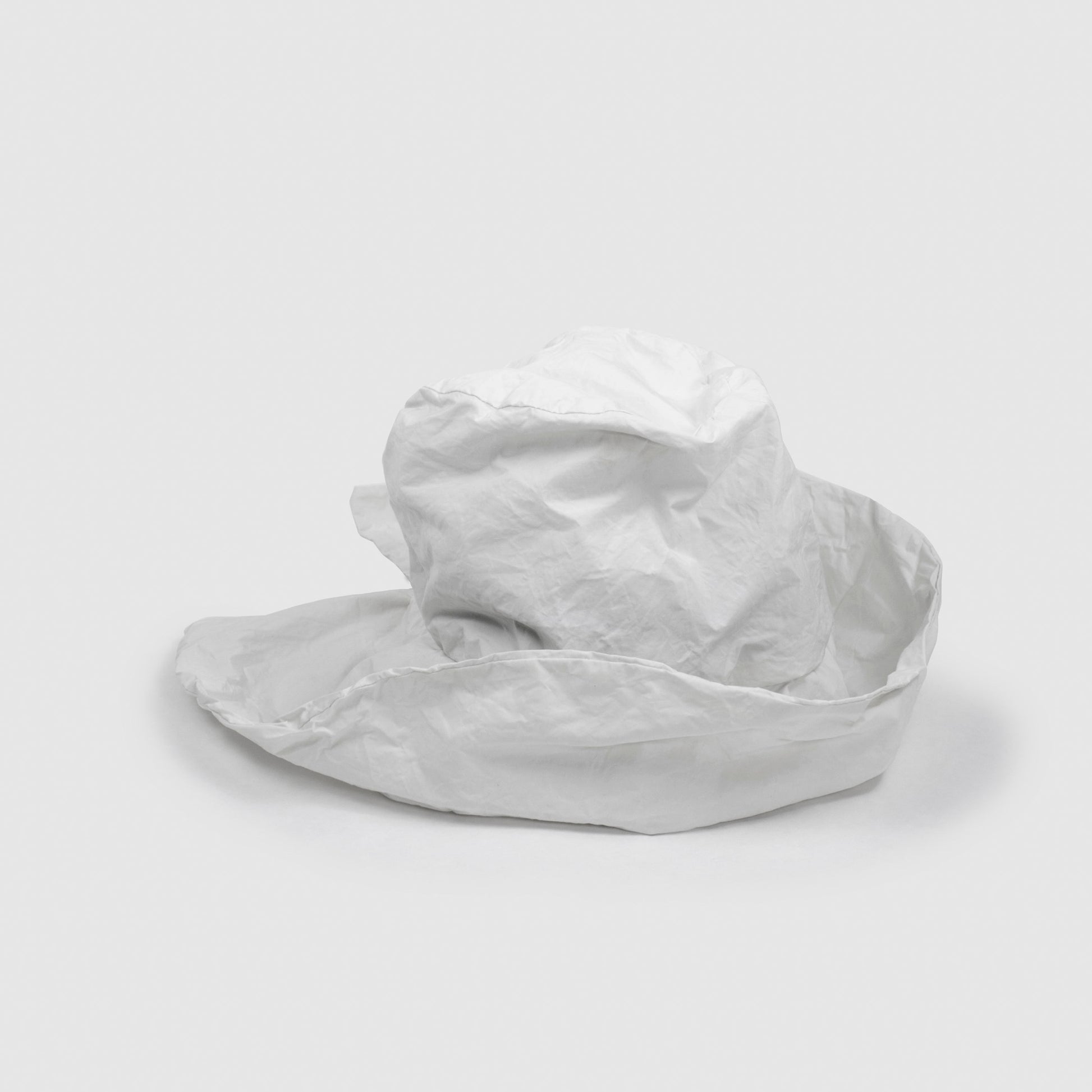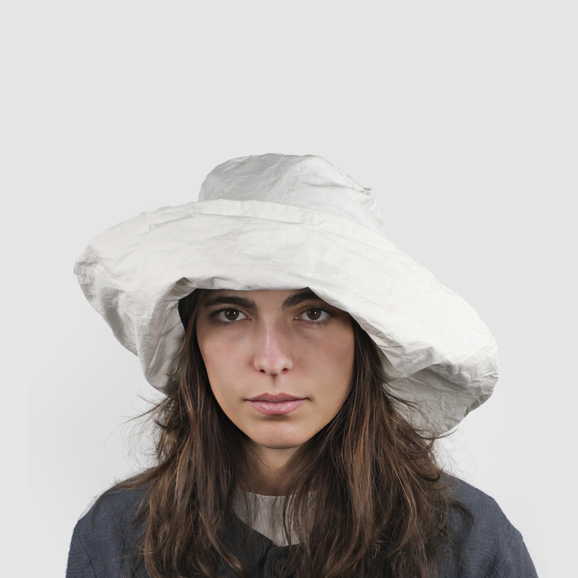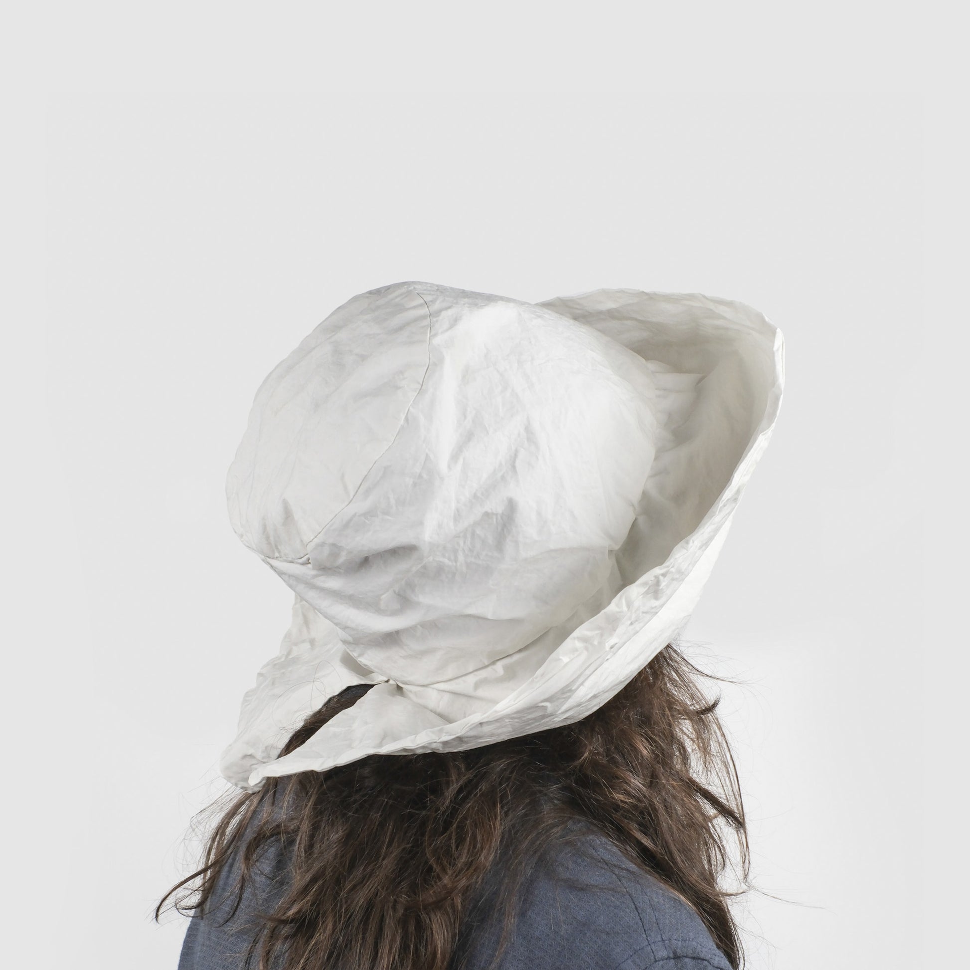 BIANCA is a hat with a wide, soft visor and an opening at the back, like a swallowtail.